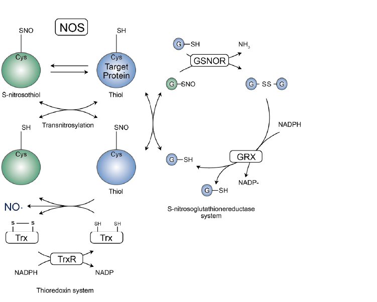 蛋白质的硫醇残基可以通过与NO集团和不同的硫醇底物发生特定反应形成S亚硝基硫醇, 其可以直接与NO作用也可通过在硫醇盐和S-亚硝基谷胱甘肽(GSNO)反应时形成。由于此过程的可逆性, 后一种化合物GSNO也同样促进S-亚硝基化反应, 因此会在氧化还原对GSH/GSNO和氧化还原对蛋白-SH/蛋白-SNO之间产生一种动态平衡。其实GSNOR通过与GSNO反应生成氧化谷胱甘肽二硫化物(GSSG)和氨(NH3), 因此而降低S-亚硝基醇的浓度, 随后谷氧还蛋白(GRX)通过将GSSG还原为GSH, 维护并稳定这个SNO的系统。 当然一氧化氮(NO)分子集团也可以直接转移到蛋白上发生修饰, S-亚硝基硫醇的动态平衡同样依靠于硫氧化还原蛋白/硫氧化还原蛋白还原酶(Trx/TrxR)系统, Trx-介导的SNO蛋白还原化为硫醇是通过对NAPDH的氧化为代价, 最终并产生NO去介导相关信号通路。